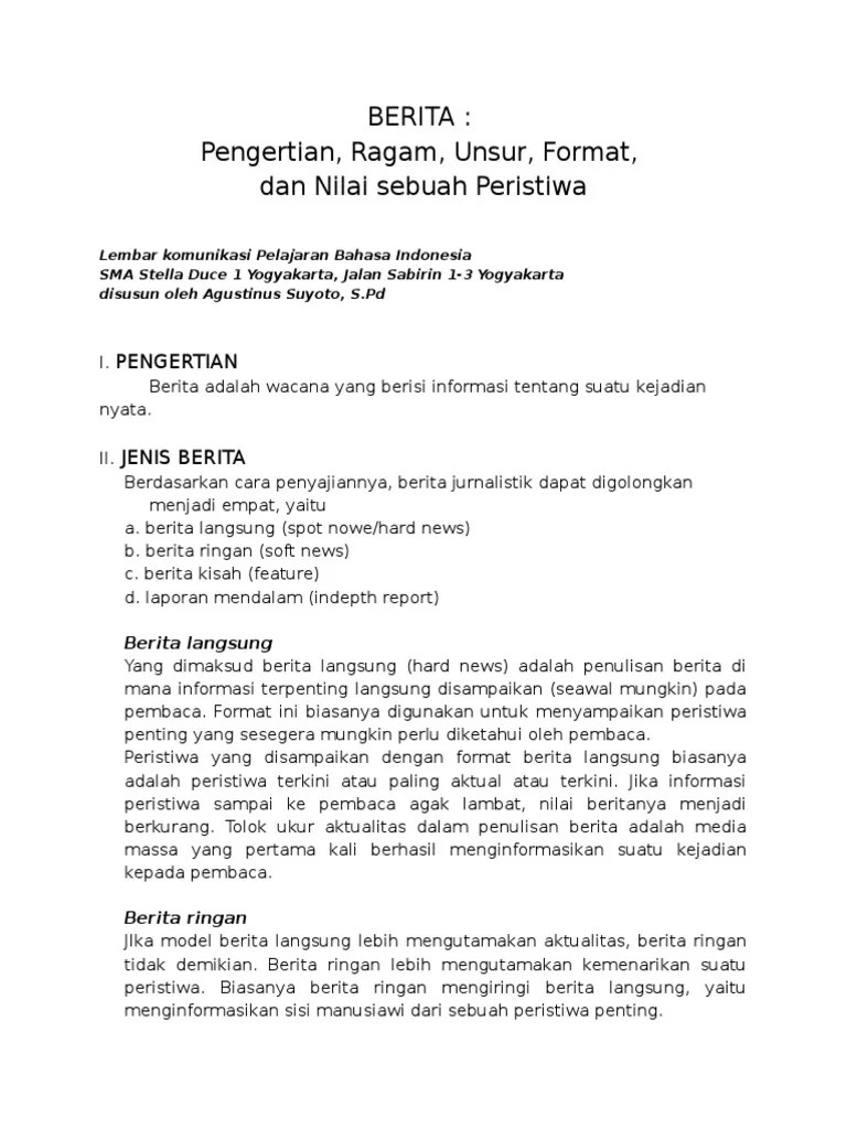 Silahkan anda klik link tentang kumpulan contoh naskah berita hard news doc yang ada di bawah ini. Contoh jenis berita hard news soft news dan feature . Soft news, nilai beritanya di bawah hard news dan lebih merupakan berita pendukung. Hard news, adalah berita penting yang harus disampaikan langsung ke publik. Berita jenis ini tidak bisa ditunda pemberitaanya karena akan cepat . Soft news, adalah suatu berita lunak atau sifatnya . Hard news atau berita keras merupakan segala informasi yang sifatnya penting dan menarik untuk segera disajikan kepada . Hard news, adalah berita penting yang harus disampaikan langsung ke publik. Kumpulan gambar tentang hard news contoh, klik untuk melihat koleksi gambar lain di kibrispdr.org. News values are criteria that influence the selection and presentation of events as. Hard news atau spot news adalah berita yang paling umum dan paling banyak ditemukan. Berita terjadinya perang sipil, hasil pemilu politik, terorisme, guncangan ekonomi negara. Posko bantuan bencana tsunami aceh segera .